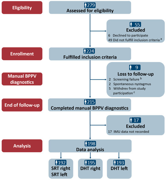 Of the 279 participants who were assessed for eligibility, 224 (80.3%) were included. During the study period, nine (4.0%) participants were lost to follow-up: four were excluded, and five withdrew from study participation due to side effects related to the diagnostics with the mechanical rotation chair in the major study (the relationship between this study and the major study is described in the “Materials and Methods” section). Of the 215 participants who completed the study, 17 (7.9%) participants were excluded due to data loss during the Bluetooth transfer from the 6DOF IMU sensor. Hence, a total of 198 participants were included in the data analyses. The data were assessed to be of sufficient quality in the vast majority of the SRTs (n = 192) and the DHTs (right: n = 195, left: n = 192). The examiner and the participants reported no adverse events during the traditional manual diagnostics. Please refer to Figure 4 for a detailed description of the participant flow.