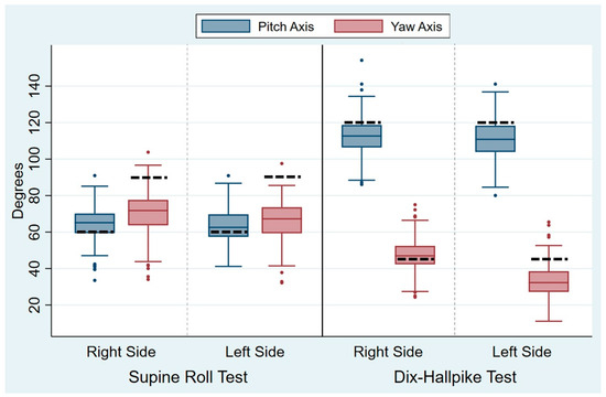 Absolute means of the head angles during traditional manual diagnostics. For clarity of the graphs, the absolute means of the head angles are displayed. Each set of blue and red boxes represents the right and left sides in the Supine Roll Tests (left side of the figure) and the right and left sides in the Dix–Hallpike tests (right side of the figure) for the absolute means of the pitch axis head angles (blue boxes) and the yaw axis head angles (red boxes). The boxes visualize the median quartile (central line through the box), the upper quartile (top of the box), and the lower quartile (bottom of the box). The T-shaped whiskers extend to the maximum (upper) and minimum (lower) data point within 1.5 times the interquartile range. Values further away are considered outliers (dots). The dashed black line represents the target head angles (Supine Roll Test: target pitch angle = 60°; target yaw angle = 90°. Dix–Hallpike test: target pitch angle = 120°; target yaw angle = 45°).