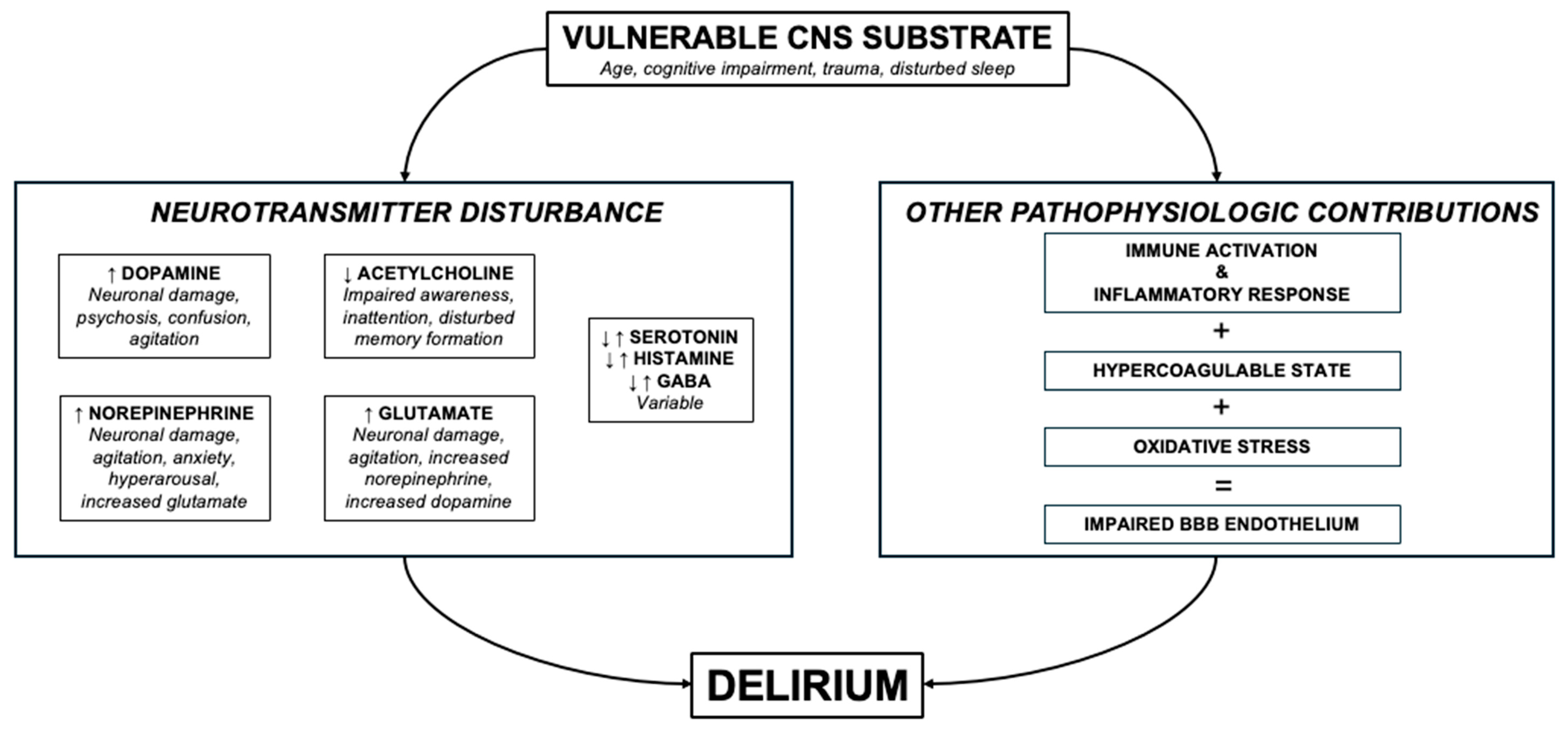 Disturbance in neurotransmission is not the only pathway by which delirium develops. Multiple predisposing factors also contribute, including impaired cognitive functioning, other CNS injuries, including trauma, polypharmacy, and sleep disruption [18,19,20,25]. Many of these contributors are non-modifiable, present in ICU populations, and elevate the delirium risk precipitously. Precipitating factors for delirium involve inflammation and oxidative stress, both of which play major roles in the development of ICU delirium specifically [17,19,34]. Metabolic dysfunction, cytokine activation, and pro-inflammatory mediator signaling increase the vulnerability of the brain to insult and subsequent delirium. In sepsis, the hypercoagulable state combined with reduced fibrinolysis both result in microthrombosis, tissue hypoxia, and potential CNS injury [17,34,37]. The total effect of these cascades results in blood–brain barrier permeability, impacting the susceptibility of the CNS to neurotoxins, overall increasing brain inflammation, and further oxygenation deficits, all of which perpetuate brain dysfunction [17,38,39].