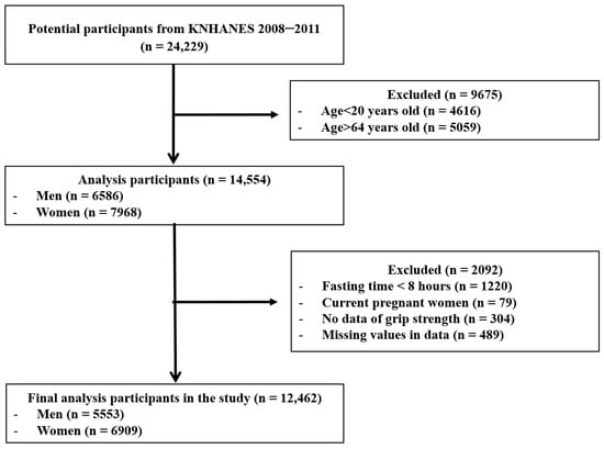 This study used data from the Korea National Health and Nutrition Examination Survey (KNHANES), conducted by the Korea Disease Control and Prevention Agency (KDCA). We performed a secondary analysis using the KNHANES dataset, which includes muscle and body fat mass data collected between 2008 and 2011. This period was selected because it includes measurements of muscle mass and body mass, which were essential variables for evaluating the anthropometric indicator in this study. The initial cohort consisted of 37,753 individuals from the 2008–2011 KNHANES dataset. This study focused on adults aged 19–65 years; therefore, participants aged < 19 years or ≥65 years (n = 15,746) were excluded. Additionally, pregnant women (n = 157) were excluded to minimize the effects of physiological changes due to pregnancy, and participants who did not fast for at least 8 h (n = 1987) were excluded to ensure the accuracy of blood sugar and lipid measurements. Furthermore, participants without muscle and body fat mass measurements (n = 5662) and those with missing values for the measurement indices (n = 476) were excluded. The final analysis included 13,725 participants (5888 men and 7837 women). All study participants included in the 2008–2011 KNHANES dataset provided their consent to participate in the survey by signing a consent form. The study was conducted in accordance with the Declaration of Helsinki and was approved by the Research Ethics Review Committee of KDCA (approval numbers: 2008-04EXP-01-C, 2009-01CON-03-2C, 2010-02CON-21-C, and 2011-02CON-06-C, respectively). The participant selection process is illustrated in Figure 1.
