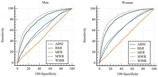 For men, the AUC values were as follows: BMI, 0.756 (95% CI, 0.744–0.758); WHtR, 0.792 (95% CI, 0.782–0.803); MFR, 0.732 (95% CI, 0.720–0.743); MWR, 0.642 (95% CI, 0.630–0.655); and ABSI, 0.671 (95% CI, 0.659–0.683). The descending order of the AUC values was WHtR, BMI, MFR, ABSI, and MWR, with statistically significant differences observed among the indicators (p < 0.001). The analysis also identified the optimal cutoff values, sensitivity, specificity, PPV, NPV, and accuracy for each indicator. The cutoff values for men were as follows: BMI = 24.59 kg/m2, WHtR = 0.511 cm/cm, MFR = 3.417 kg/kg, MWR = 0.616 kg/cm, and ABSI = 0.0776 m11/6/kg−2/3. WHtR demonstrated the highest PPV, NPV, and accuracy among all the indicators.
