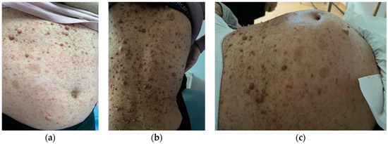 (a–c) Patient no. 2′s eruption (multiple café-au-lait spots and brown soft tumors disseminated on the patient’s skin).