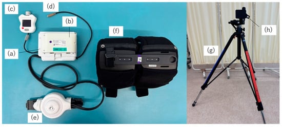 Figure 1. Structure of the hip abduction HAL. The hip abduction HAL system consists of (a) a control device, (b) a battery, (c) a manual controller, (d) an electrode cable, (e) a power unit, (f) a thigh belt, (g) a tripod-based platform, and (h) an attachment. HAL, hybrid assistive limb robot.