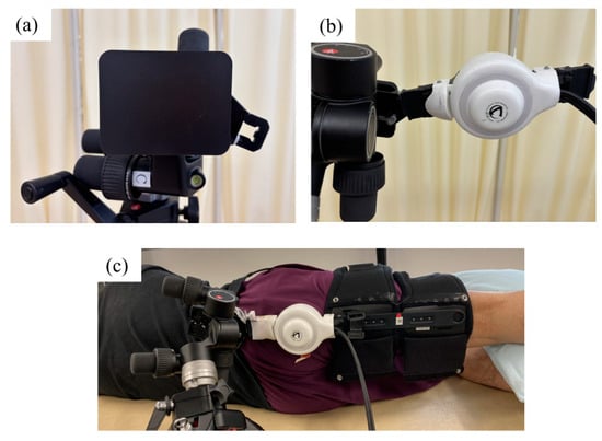 Figure 2. (a,b) The distal portion of the single-joint HAL, originally designed for the knee joint, is attached to the tripod-based platform using a custom attachment. (c) The proximal portion is secured to the participant’s thigh using the standard thigh belt. Participants are positioned in a side-lying posture on a bed near the tripod-based platform. The rotation axis of the single-joint HAL is aligned with the femoral axis, and the power unit is adjusted to rest at the level of the greater trochanter against the gluteal region. HAL, hybrid assistive limb robot.