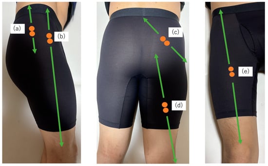 Figure 3. The EMG electrode placement: (a) gluteus medius, (b) tensor fasciae latae, (c) gluteus maximus, (d) biceps femoris, and (e) rectus femoris.