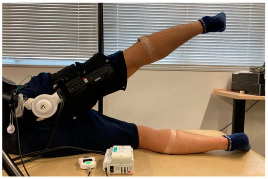 The participants were positioned in a side-lying posture on a bed near a tripod-based platform. The rotation axis of the single-joint HAL was aligned with the femoral axis, and the power unit was adjusted to rest at the level of the greater trochanter against the gluteal region (Figure 2). To detect the bioelectrical signals during hip abduction, sensors were placed on the surface of the gluteus medius. The electrodes were placed based on anatomical landmarks following the SENIAM guidelines [14], positioned along the line connecting the iliac crest and greater trochanter at 50% of the line’s length. Proper placement was confirmed by detecting muscle activity in the gluteus medius during isometric contractions in voluntary hip abduction movements.