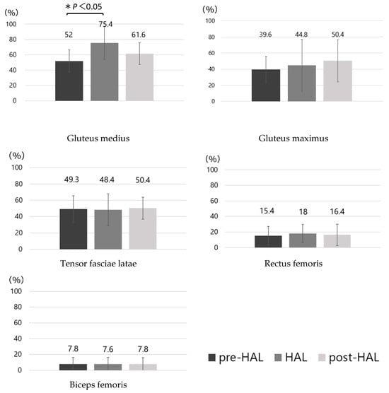 Figure 5. Mean muscle activity. Muscle activity levels normalized to maximum contraction are reported along the y-axis. Comparisons are made between the pre-HAL, HAL, and post-HAL conditions for each muscle. ANOVA was performed, followed by Bonferroni’s multiple comparison test for the three comparison patterns: pre-HAL vs. HAL, HAL vs. post-HAL, and pre-HAL vs. post-HAL. A significant difference is found between pre-HAL and post-HAL for the gluteus medius (*: p < 0.05). HAL, hybrid assistive limb robot; ANOVA, repeated-measures analysis of variance.