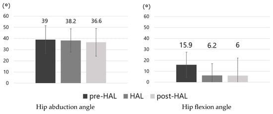 The results of hip abduction and flexion angles during hip abduction–adduction movements in the pre-HAL, HAL, and post-HAL periods are shown in Figure 6. Although no significant differences were observed, the hip flexion angle tended to decrease in the HAL (6.2 ± 10.8°) and post-HAL (6 ± 16.1°) periods compared with that in the pre-HAL period (15.9 ± 11.5°).