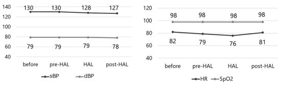 Figure 7 shows the variations in the vital signs measured before and after the pre-HAL, HAL, and post-HAL sessions. No significant changes were observed in the vital signs. The VAS score for hip pain was 0 for all the participants, and none reported experiencing pain after the exercise.