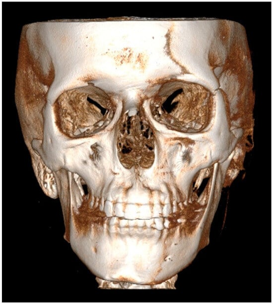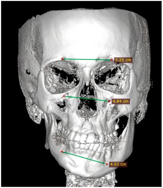 A total of 30 CBCT/LDCT scans were evaluated. All of them were enrolled from the authors’ database, studied, and measured in the RadiAnt Dicom Viewer Software version 2020.2.1 (Medixant, Poznań, Poland). CBCT of the patients included in the study was at a maximum size of 20 × 20 cm. Gathered DICOM images helped to establish a 3D-CBCT visualization of each participant’s facial skeleton anatomy. A skull with perfect symmetry is presented in Figure 1. Each radiological datum was closely evaluated based on the position of the supraorbital, infraorbital and mental foramen. Gathered data and variables have been categorized and put into each specific patient’s archive. Information on the facial skeleton was studied and evaluated.