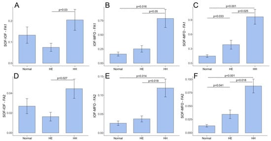The differences in FA1 (A–C) and FA2 (D–F) indices between the condylar hyperplasia CH/HH, HE, and control groups. The p-values for the post-hoc test group pair comparisons are shown above the dashed lines. Notably, the infraorbital-mental foramen and supraorbital-mental foramen FA1/2 indices in the condylar hyperplasia (CH) group are significantly higher than those in the hemimamandibular elongation cases (HE) and control groups.
