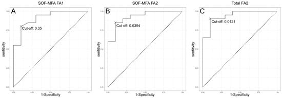 The predictive values of the FA1 and FA2 indices were evaluated using receiver operating characteristic (ROC) curves. Table 3 presents the sensitivity, specificity, positive predictive value, negative predictive value, and area under the curve for the most optimal cut-offs. Figure 8 illustrates the receiver operating characteristic (ROC) plots for the most optimal predictors identified in the current study. In addition to the evaluation of the FA1 and FA2 indices for distinct pairs of measurements, the sum of all FA indices was also assessed.