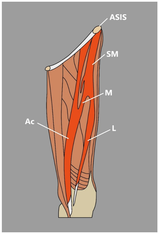 - Kim et al. [7] Presented an interesting case of a bifurcated SM connected with the presence of a unique morphological variation—an accessory SM found during dissection. In the mentioned study, SM originated from the anterior superior iliac spine and then divided into medial and lateral heads of the SM [7]. The lateral head traveled to its site of insertion—the medial aspect of the patella; however, the medial head formed a muscular belly to the vastus medialis and later united with accessory SM, which originated from the inguinal ligament, merged with the medial head of the SM and inserted onto the PA [7] (Figure 2).
