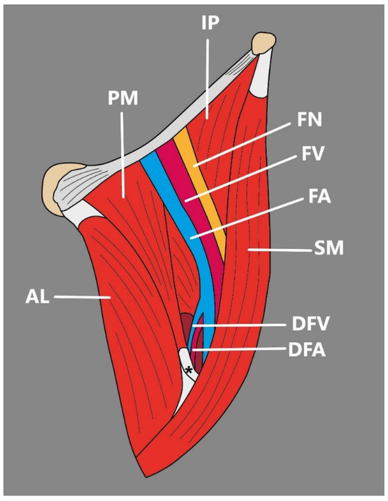 Schematic presentation of the variable pectineus muscle presented by Kim et al. [37]. The tendon of the superficial layer is indicated by an asterisk (*). PM: pectineus muscle. AL: adductor longus muscle. IP: iliopsoas muscle. SM: sartorius muscle. FV: femoral vein. FA: femoral artery. DFA: deep femoral artery. DFV: deep femoral vein. FN: femoral nerve. (*) the tendon of the superficial layer.