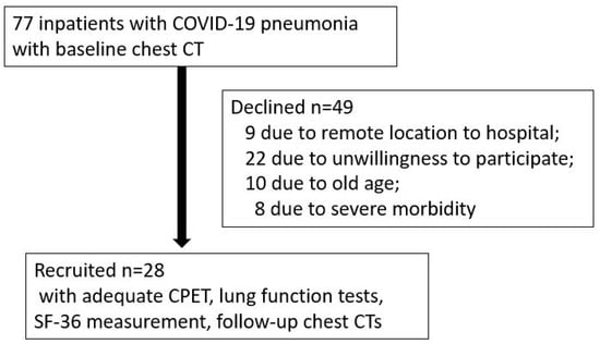 Study design and participants: This prospective cohort study included patients who were discharged from the Pulmonary Ward with a confirmed diagnosis of COVID-19 pneumonia between March 2020 and April 2021. In all, 77 patients were asked to participate in the study 6 months after discharge from hospital, and 28 of them who provided informed consent were enrolled (Figure 1). The majority (n = 20) of them were hospitalized during the first outbreak of the pandemic (March–May 2020). Inclusion criteria were as follows: adult patients (≥18 years) with confirmed COVID-19 pneumonia based on RT-PCR, clinical and radiological findings during hospitalization, discharged home after recovery, and willing to participate in follow-up assessments. Exclusion criteria were the presence of pre-existing cardiopulmonary diseases, musculoskeletal disorders affecting exercise capacity, and inability to perform CPET. The main reasons for not participating were unwillingness to participate, remote location to hospital, old age, severe comorbidities.