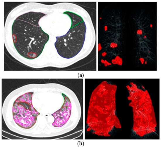 PI severity was assessed using baseline chest CT scans obtained during hospital stay for COVID-19 pneumonia. All patients were examined with a 64-detector row CT scanner (Somatom® Definition AS; Siemens Healthineers, Forchheim, Germany). Scanning was carried out in supine position and after full inspiratory breath-hold. Ground-glass opacities (GGO), consolidations, and interstitial abnormalities were recorded and summed up regarding the occupied percentage of both lungs. It was repeated when patients returned for follow-up to have a detailed evaluation at the same time as CPET. Patients were categorized into high and low PI groups based on a threshold of 25%. Chest CT images were further analyzed using artificial intelligence (Syngo Via Version VB60A_HF08) to quantify the degree of lung involvement [] in a subgroup of 22 patients. Six patients had CT scans performed in other hospitals before admission to the study hospital and therefore could not be analyzed with the AI software. The image analysis for the pneumonia severity score was performed by an automated lung opacity analysis program, “CT Pulmonary Density”, supplied by Siemens Healthineers (Forchheim, Germany), which was previously validated externally []. Utilizing 3D segmentations of lesions, lungs, and lobes, the algorithm assesses the volumes of lobes and lungs along with areas of high opacity, which include ground glass and consolidation. The extent of involvement (total opacity score) was determined by calculating the ratio of the volume of high-opacity regions to the total lung volume. Two examples are illustrated in Figure 2.