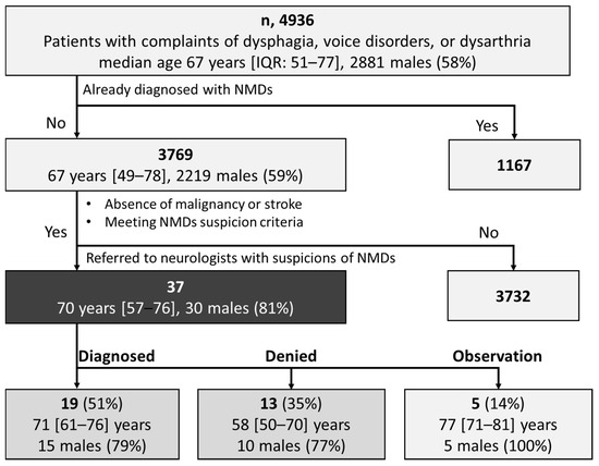 Figure 1 shows the demographic data of all 4936 patients (2881 males, 58%; median age, 67 years; interquartile range [IQR] (51–77) years) who were eligible and included in this study. Of these, 1167 patients (662 males, 57%; 67 [56–76] years) had already been diagnosed with NMDs, while 3769 patients (2219 males, 59%; 67 [49–78] years) had not received a diagnosis of an NMD. Among the undiagnosed patients, 37 (30 males, 81%; 70 [57–76] years) were referred to a neurologist with suspicion of NMDs during outpatient examinations, comprising 0.98% of the undiagnosed patients. Within this group, 19 patients (51%) received a confirmed diagnosis of NMDs (diagnosed group), 13 patients (35%) received a negative diagnosis (denied group), and 5 patients (14%) were under ongoing observation without a definitive diagnosis (observed group) (Figure 1). This demonstrated that the positive predictive value of the NMD suspicion criteria is higher than 50%.