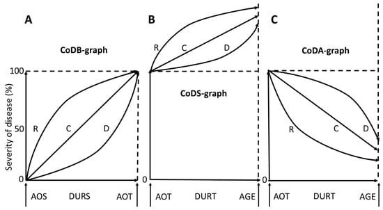 As explained in the methods for each of the CoDB-, CoDS-, and CoDA-graph categories, three types of severity drawing were distinguished: (i) the type indicating a rapid worsening or improvement (R-type), (ii) the type describing a continuous development of the disease either worsening or improvement (C-type), and (iii) the type indicating a delayed worsening or improvement (D-type) (Table 2).