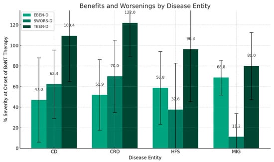 Comparative analysis of treatment impact across disease entities. This bar chart represents the mean values of benefit (EBEN-D; left light gray bar), “suspected” worsening (SWORS-D; dark gray bar in the middle), and total benefit (TBEN-D = (EBEN-D) + (SWORS-D; right black bar) for patients with cervical dystonia (CD), other cranial dystonia (CRD), hemifacial spasm (HFS), and migraine (MIG) at the day of recruitment. Standard deviations, indicating the variability of the responses within each disease entity, are presented as error bars.