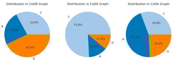 Highly significant (chi2-testing: p < 0.001) difference in the proportional distributions of three response types (R-, C-, D-type) across the three graph categories (CoDB-, CoDS-, CoDA-graphs). The three pie-charts highlight the relative percentages of R-, C-, and D-response types within the overall CoDB, CoDS, and CoDA graph categories.