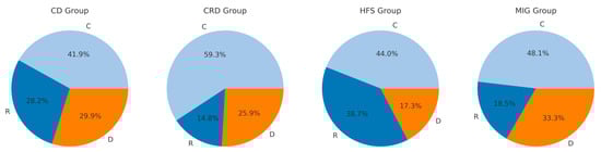 In Figure 4 the distributions of the R-, C-, D-types are presented for the four patient groups. Chi2-testing (chi2(6) = 29.848; p < 4.201 × 10−5) showed that the distributions of the graph types produced by the four different patient subgroups were significantly different (Figure 4). In all four patient groups, the C-type was the most frequently drawn type of CoD-graphs. But in the HFS-group much more R-graphs were drawn than D-graphs, whereas in the CRD- and MIG-group more D-graphs were drawn than R-graphs.