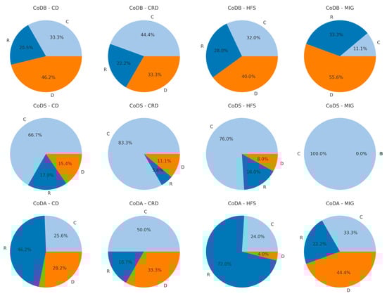 Proportional distributions of the three R-, C-, D-response types across the four disease entities (CD = column 1; CRD = column 2; HFS = column 3; MIG = column 4) for all CoDB-graphs (row 1), all CoDS-graphs (row 2) and all CoDA-graphs (row 3).