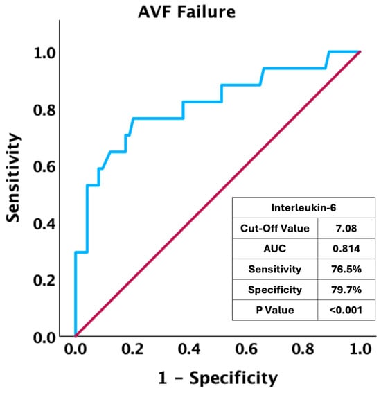 We performed ROC analysis on IL-6 values to determine the association between baseline levels of this inflammatory biomarker and long-term AVF failure. As shown in Figure 1, we found a strong association (AUC: 0.814, p < 0.001), with an optimal cut-off value of 7.08 (76.5% Sensitivity and 79.7% Specificity).