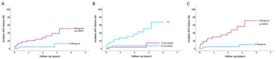 Furthermore, at the survival curve Kaplan–Meier analysis, we observed a higher occurrence of AVF failure in patients with baseline IL-6 values above the median (p = 0.004) (Figure 2A), as well as in patients with IL-6 values in the third tertile compared to the first and second tertiles (p = 0.003 and p = 0.002) (Figure 2B). Moreover, as shown in Figure 2C, patients with preoperative IL-6 values higher than the optimal cut-off value face a significantly increased risk of AVF failure (p < 0.001).