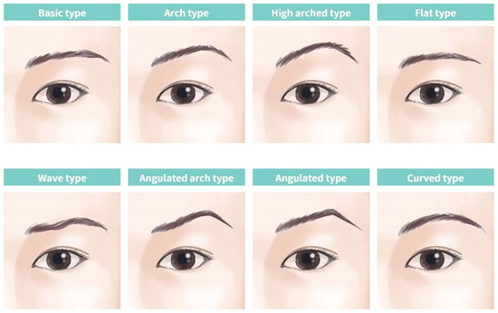 - Jung, G.S.; Chung, K.H.; Lee, J.W.; Yang, J.D.; Chung, H.Y.; Cho, B.C.; Choi, K.Y. Eyebrow position and shape favored by Korean women. J. Craniofac. Surg. 2018, 29, 594–598. [Google Scholar] [CrossRef] [PubMed]