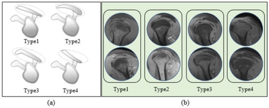 Graphical representation of acromion subtypes (a) and sample images of the shoulder MRI data set’s (b). Figure 1a presents a graphic representation of acromion subtypes . Moreover, Figure 1b presents (a) and sample images of the shoulder MRI data set’s Type 1, Type 2, Type 3, and Type 4 classes (b).