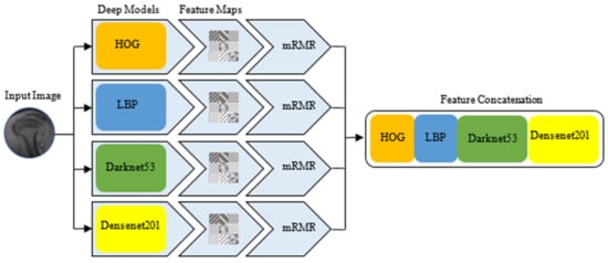 The deep learning method combines several processing layers and abstraction structures to learn data representations [15]. Choosing the appropriate features is crucial to the effectiveness of machine learning techniques [16]. Various preprocessing, dimensionality reduction, feature selection, etc., reveal these features. In computer vision and image processing, HOG is an effective feature descriptor for object recognition [17]. The LBP operator labels each pixel in an image by thresholding its neighboring pixels in the surrounding 3 × 3 neighborhood according to the center pixel value. The surrounding pixel is assigned the value 1 if its value is larger than or equal to the center pixel and 0 otherwise. For a neighborhood, an 8-bit LBP code is thus generated. The mRMR algorithm’s filtering technique seeks to minimize redundancy among the features it selects while choosing the most pertinent characteristics with class labels [18].