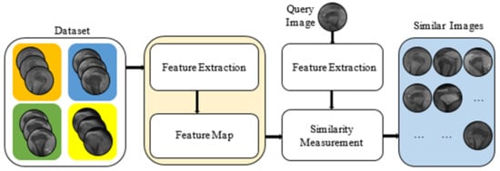 The purpose of the CBIR system is to display the images in the data set that show the closest similarity to the queried image. CBIR systems are computer vision applications developed to solve the problem of retrieving the desired image from an extensive database of digital images [19]. CBIR consists of two primary stages: feature extraction and similarity calculation. The feature extraction phase is first performed in the image database. In the relevant process, a feature database is created with color, texture, and shape descriptors. In the similarity calculation phase, the feature extracted from the query image is compared with those in the feature database. In CBIR, the query is not performed at the pixel level but at the level of equal-length vectors representing the image. The image representation power, number, and computational complexity of the resulting vectors affect the methods’ performance. CBIR’s other elements are the user feedback, image database, and performance evaluation [20].