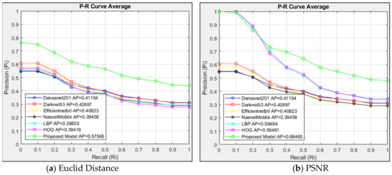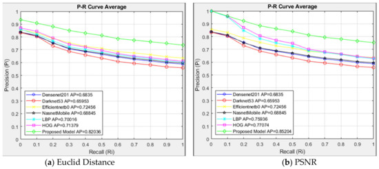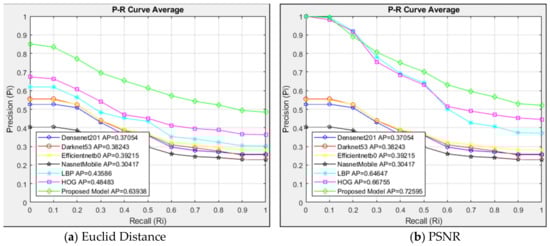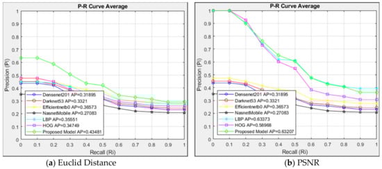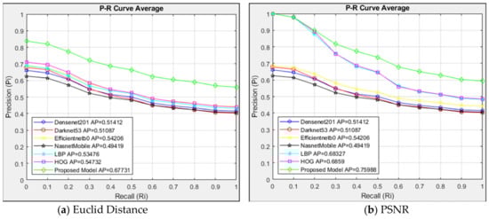 Comparing Figure 9a,b, it can be seen that, in the suggested model, the PSNR technique outperformed the Euclidean method in similar image access, with an AP = 0.76. Despite the Euclidean method’s lesser sensitivity, the PSNR approach produced a higher sensitivity at R = 0. Compared to the Euclidean technique, the PSNR method is more sensitive to HOG and LBP architectures.