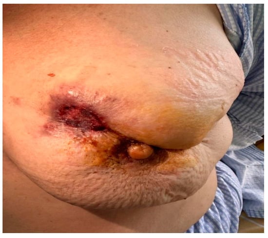 Clinical image of Case 2—T.T., June 2021. The figure illustrates approximately a 6 cm ulcerated tumor with irregular margins, skin changes, and involvement of the areola.