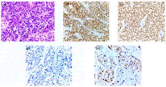 Immunohistochemistry of Case 1—G.S. (a) HE × 400: Invasive breast carcinoma NST (invasive ductal carcinoma NOS)-G3: sheets of large, pleomorphic tumor cells with frequent mitotic figures; (b) ER × 200: Estrogen receptor positive with strong nuclear expression in tumoral cells; (c) PR × 200. Progesterone receptor positive with strong nuclear expression in tumoral cells; (d) HER2 × 400: negative (no staining observed in tumor cells); (e) Ki67 × 200: Estimated Ki67 labeling index is ~70%.