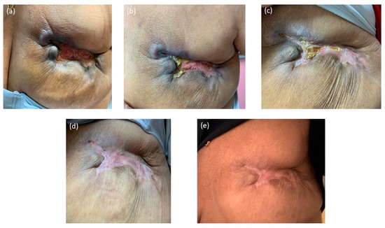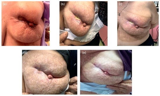 The clinical improvement of Case 2—T.T., after treatment completion, over a period of 12 months. (a) August 2021, one month after the treatment was initiated. (b) October 2021, the ulcerated tissue starts to reduce its dimensions, and the healing crusts begin to appear. (c) November 2021, a more intense cicatricial tissue is forming, while the initial lesion starts to diminish. (d) July 2022 and (e) December 2022, large post-radiotherapy changes and scarring, but no signs of secondary signs of breast cancer were identified.
