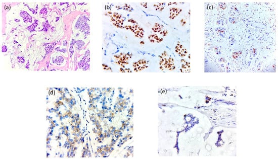 Immunohistochemistry of Case 2—T.T. (a) HE × 200: Mucinous breast carcinoma: nests of tumor cells floating in pools of extracellular mucin; (b) ER × 200: Estrogen receptor positive with strong nuclear expression in tumoral cells; (c) PR × 200: Progesterone receptor positive with variable nuclear expression in tumoral cells; (d) HER2 × 400: weak to moderate complete membrane staining observed in >10% of invasive tumor cells (score 2+/equivocal); (e) Ki67 × 200: Estimated Ki67 labeling index is 5%.