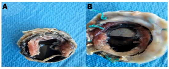 Patients with a confirmed diagnosis of a stuck valve underwent either pannus cleaning or valve replacement, depending on suitability. Pannus cleaning was performed in five suitable patients, while valve replacement was conducted in the remaining twenty-two patients. During surgery, the pathological findings, including pannus and thrombus formations on the excised valve, were thoroughly examined and documented. The decision between pannus cleaning and valve replacement was made based on the extent and localization of the pannus formation, as well as the overall structural integrity of the prosthetic valve. Pannus cleaning was performed in cases where the obstruction was localized and the valve structure was otherwise functional, while valve replacement was chosen for cases of extensive pannus formation or additional structural damage affecting valve performance. Pannus cleaning emerged as a valuable strategy in preserving the original valve, particularly in selected cases with localized pannus formation. As shown in Figure 2, the mechanical obstruction caused by pannus formation significantly impaired the movement of the valve leaflets, necessitating surgical intervention.