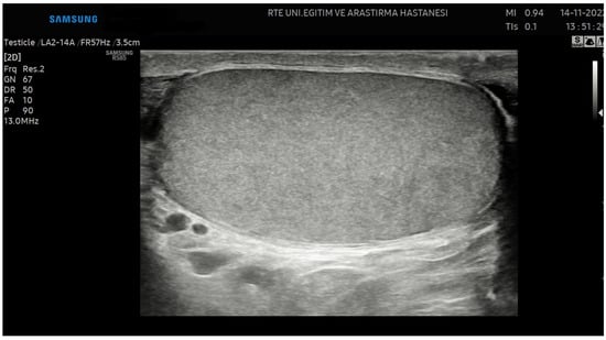 Ultrasonography examinations for all patients in this study were performed by a single radiologist using the Samsung RS85 Prestige Ultrasonography device with the LA2-14A linear probe. The testicular preset, THI mode, and 13.0 MHz parameters were standardized for all patients. To ensure consistency and avoid altering grayscale values, the Tissue Gain Compensation (TGC) was kept constant, and the gain settings were not modified for any patient.