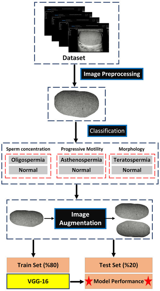 The VGG-16 deep learning architecture was utilized for the classification of sperm parameters, including sperm concentration, progressive motility, and morphology, using ultrasonography images. For each group, 80% of the dataset was used for training, while the remaining 20% was allocated for testing. The number of images used during the training and testing phases is provided in Table 4. The classification results for the test set utilizing the VCG-16 deep learning architecture are presented in Table 5.