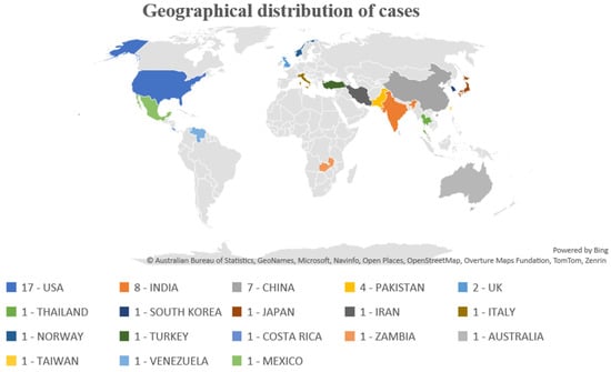 This review included 52 case report articles, 17 from the USA, eight from India, seven from China, four from Pakistan, two from the UK, and one each from Thailand, Korea, Japan, Italy, Iran, Norway, Turkey, Costa Rica, Zambia, Australia, Taiwan, Venezuela, and Mexico. A total of 99 patients were included, including 17 women (17.17%) and 82 men (82.82%). (Figure 1)