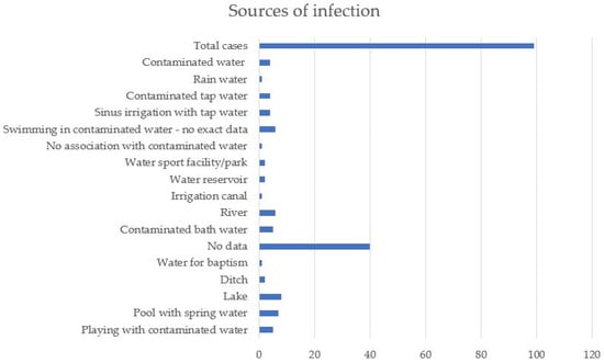 Discussing the way of infection, in 40 of the 99 cases, no exact cause or contact with contaminated water could be established, and in only one person, no link between infection and a water source was observed. Five of the patients developed symptoms after playing in areas with contaminated water, seven after swimming in pools that were irrigated with spring water, and eight and six, respectively, after swimming in lakes or rivers. One of the patients under the age of 1 died shortly after baptism, and another after being exposed to water collected after rain. For five people, symptoms started after bathing in possibly contaminated water, and six after swimming in areas where Naegleria fowleri was found after water testing. The condition of four of the patients worsened after nasal irrigation with tap water, and of another four after using tap water for various household activities. Other sources of infection were ditch water, canal irrigation, water tanks, or water parks (Figure 2).