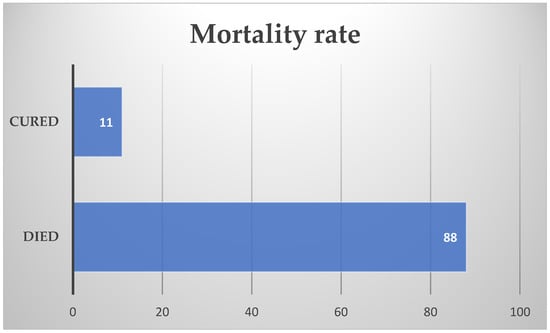 Of the 99 patients, only 11 of them survived the Naegleria fowleri infection, the mortality rate being 88.88%. (Figure 3) The hospitalization period ranged from 10 h to 4 months. Further discussion on the hospitalization period shows that the most common hospitalization period was 1–5 days (45 patients). Six patients were hospitalized for 5–10 days, 3 for 1–15 days, and 14 for more than 15 days. In one study, the hospitalization period of 13 patients was approximately 6.38 ± 3.15 days. Only one case, a 6-month-old infant, had a fulminant progression to death within 10 h.