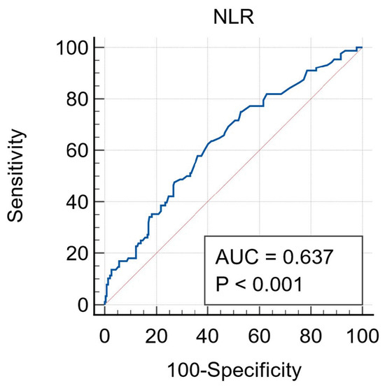 The median NLR was significantly lower in the survivors than in non-survivors (3.3 [2.3–5.5] vs. 4.6 [2.9–7.6]; p < 0.001). The ROC curve analysis showed that NLR higher than 3.8 had 62.5% sensitivity and 59.8% specificity in predicting mortality (AUC = 0.637, 95% CI: 0.58–0.69, p < 0.001) (Figure 1).