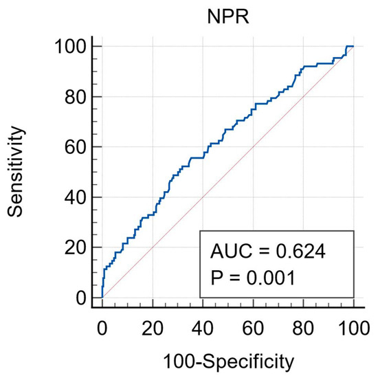 The median NPR was significantly lower in the survivors than in non-survivors (22 (15–34) vs. 29 (18–49); p < 0.001). The receiver operating characteristics (ROC) curve analysis showed that NPR higher than 30.9 had 48.9% sensitivity and 71.6% specificity in predicting mortality (AUC = 0.624, 95% CI: 0.57–0.68, p < 0.001) (Figure 2).