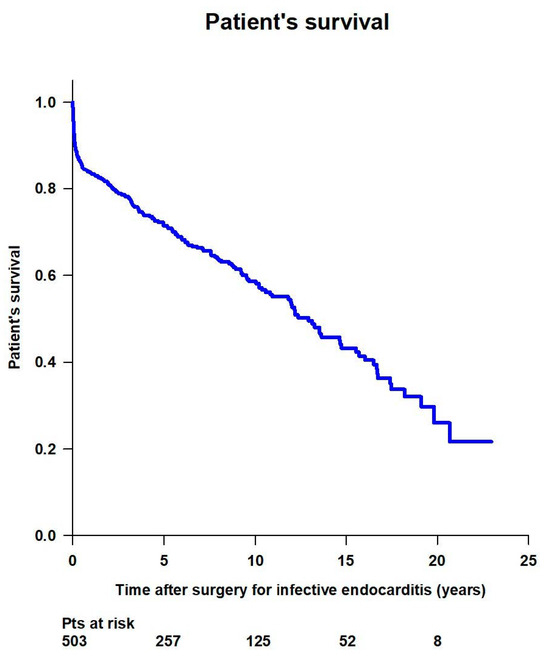 Infective endocarditis (IE) represents a challenging condition with an increasing incidence that reached 13.8 cases per 100,000 subjects per year in 2019 [1]. Despite diagnostic and therapeutic advances, IE is associated with high early and long-term mortality and morbidity, with 14–22% in-hospital mortality rates and up to 50% mortality at 10 years [2]. Surgery is required in 30–50% of the patients affected by IE, and surgical mortality ranges from 15% to 45%. Patients with prosthetic valve endocarditis (PVE) have an in-hospital mortality rate that is twice as high with more postoperative complications as compared with patients with native valve endocarditis (NVE) [3,4,5]. Early risk stratification is of paramount importance in patients with IE to determine optimal timing of surgery and to reduce complications and mortality rates. The potential diagnostic and prognostic roles of several biomarkers have been evaluated, including, among others, C-reactive protein, procalcitonin levels, interleukin (IL)-6, natriuretic brain peptides, and troponins [6,7], which reflect the complex pathophysiology of the disease involving not only inflammatory responses but also circulatory and end-organ dysfunction. The prognostic role of hematological parameters in predicting outcome in patients with IE has also been investigated [8,9,10]. However, only a few studies evaluated the role of hematological parameters in patients undergoing surgery for IE. Therefore, the aim of this study was to review our 20-year experience with the treatment of NVE and PVE and to evaluate the role of neutrophil-to-lymphocyte ratio (NLR), neutrophil-to-platelet ratio (NPR), platelet-to-lymphocyte ratio (PLR), monocyte-to-lymphocyte ratio (MLR), neutrophil-to monocyte ratio (NMR), and systemic inflammatory index (SII) on early and long-term outcomes of patients undergoing surgery for IE.