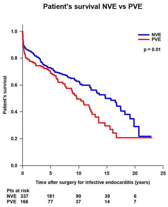 Patients with NVE had significantly better mean survival time (13 ± 0.6 years vs. 10.5 ± 0.8 years; p = 0.01) and survival rates (93.5% at 30 days, 86.1% at 1 year, 72.5% at 5 years, 62.9% at 10 years, and 50.1% at 15 years, and 34.8% at 20 years vs. 91.6% at 30 days, 78.8% at 1 year, 68.8% at 5 years, 49.6% at 10 years, and 29.6% at 15 years, and 20.7% at 20 years) compared to patients with PVE (Figure 5).