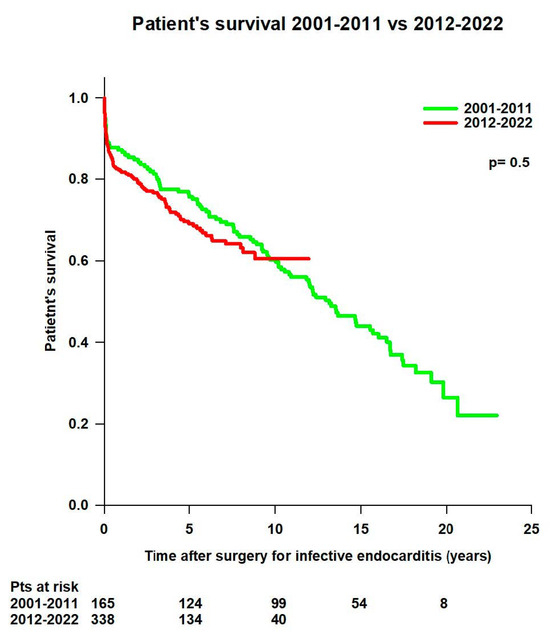 Patient’s survival according to the period of surgery for infective endocarditis (2001–2011 vs. 2012–2022).