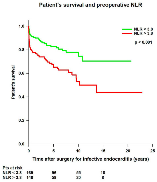 Patient’s survival after surgery for infective endocarditis, according to preoperative neutrophil-to-lymphocyte ratio (NLR) value.