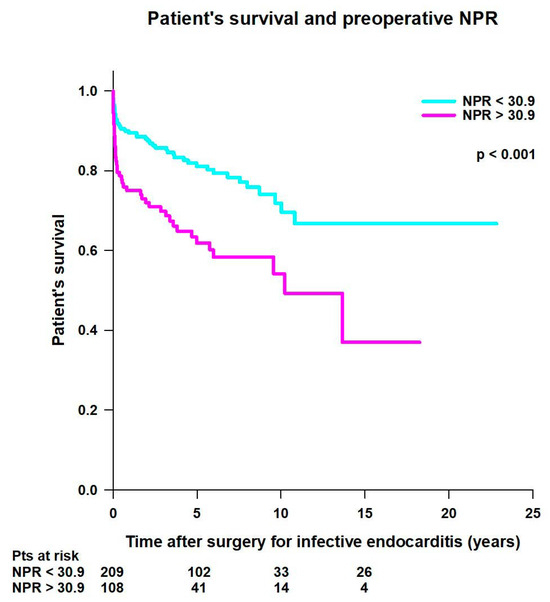 Patient’s survival after surgery for infective endocarditis, according to preoperative neutrophil-to-platelet ratio (NPR) value.